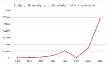 The fact that we enjoyed a real return of festivals in the summer of 2022 certainly has a fair bit to do with this increase. In 2022, QR codes were to be found everywhere at nearly 60 festivals and summer bars (compared with just 9 in 2017). And festival-goers ‘beeped’, in other words paid mobile, more than 578,000 times with the Payconiq by Bancontact app or some other banking app offering Payconiq to pay for their fries or their beer – a multiplication compared with previous years, as the chart below shows.